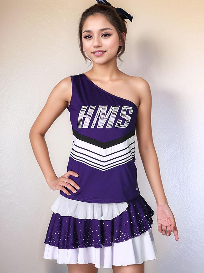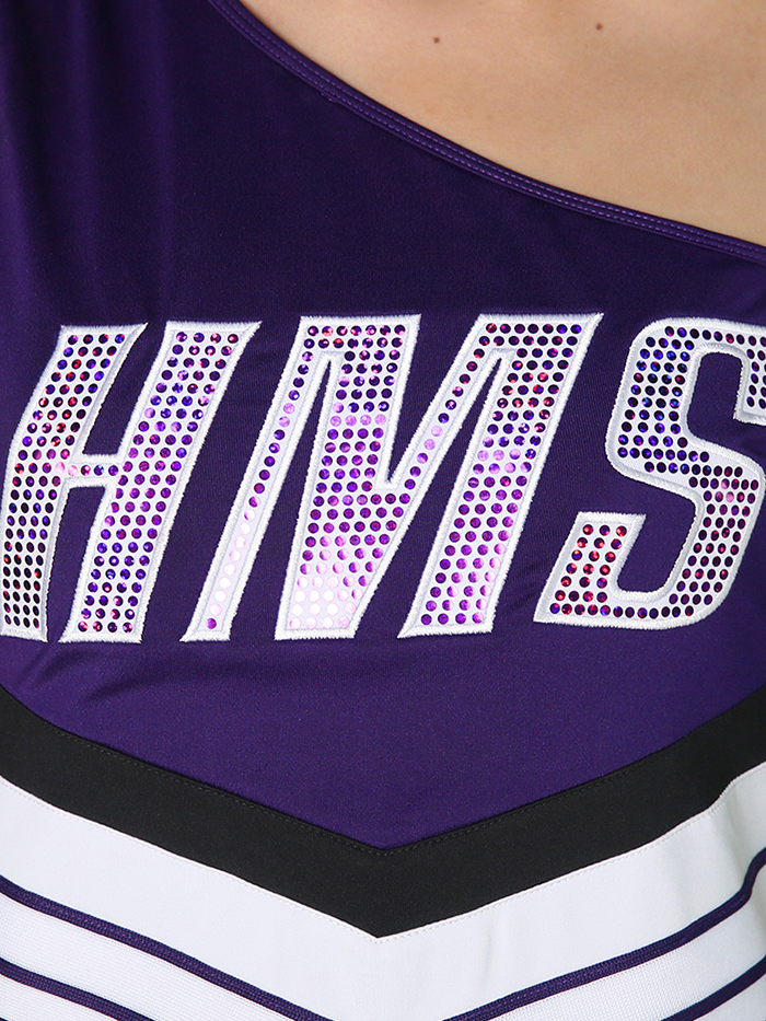Step into the spotlight with the CSU079 Cheer Uniform – a unique and spirited design that breaks away from the ordinary. Featuring a bold one-shoulder cut, this sleeveless top showcases “HMS” team lettering adorned with sparkling spangles. Sharp chevron striping adds contrast and athletic edge. The triple-layered skirt brings extra flair with alternating purple and white ruffles, all accented with dazzling spangle details. A perfect choice for standout sideline performances and pep rallies.