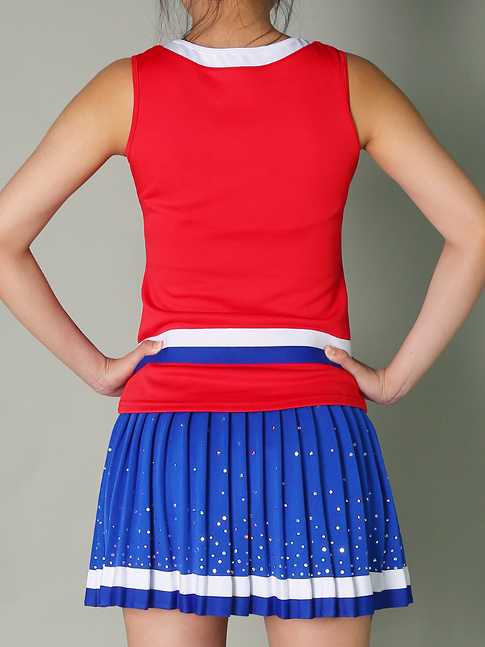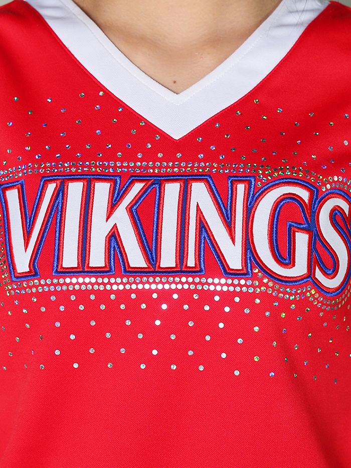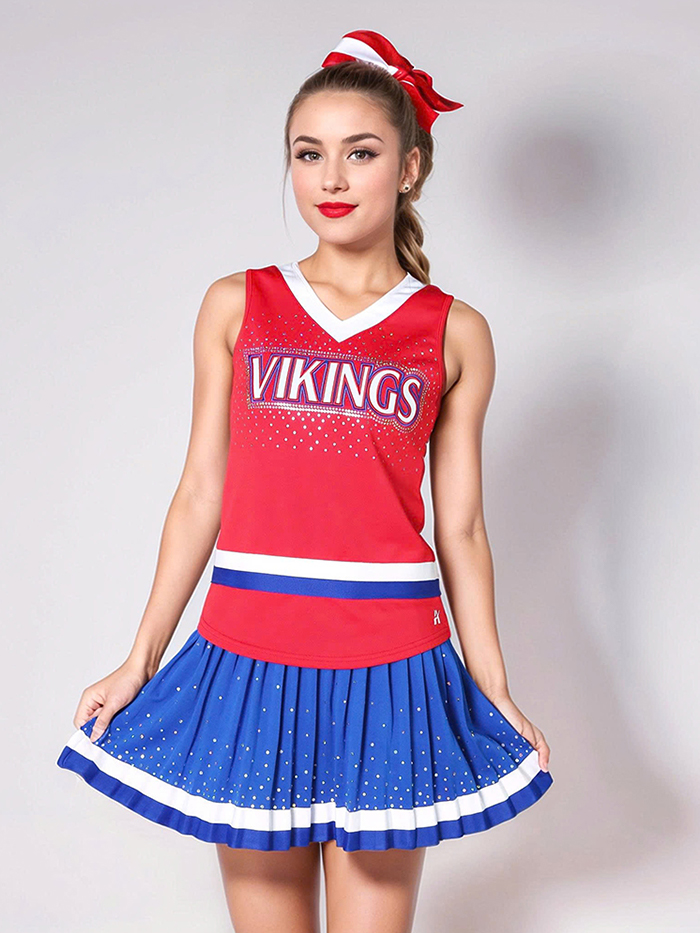 Show off team pride in style with the CSU082 Cheer Uniform – a vibrant red and royal blue combo that radiates school spirit. The sleeveless V-neck top features bold “VIKINGS” lettering outlined with sparkling spangles for high visibility and shine. A double-stripe waistband design ties the top to the pleated royal skirt, which is finished with white trim and scattered crystal spangles for extra flair. A classic look made for bold sideline energy.