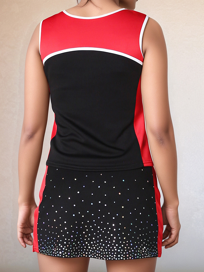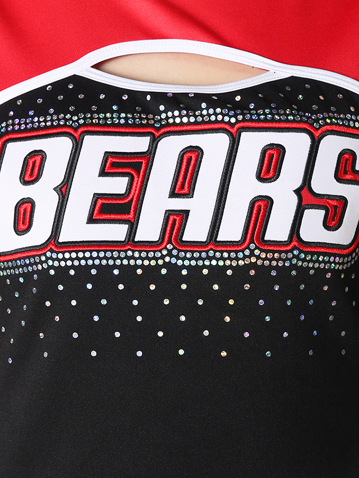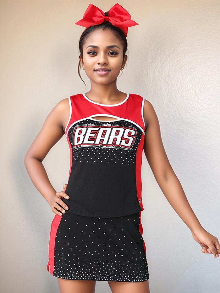 Command the spotlight in the CSU087 Cheer Uniform – a bold and athletic design made for powerful performances. The sleeveless top features a sharp red and black color block with a unique keyhole neckline and spangle-studded “BEARS” team name for standout shine. Side red panels add contrast and energy, while the fitted skirt continues the spangle pattern for a cohesive, sparkly look. Ideal for sideline domination and pep rally confidence.