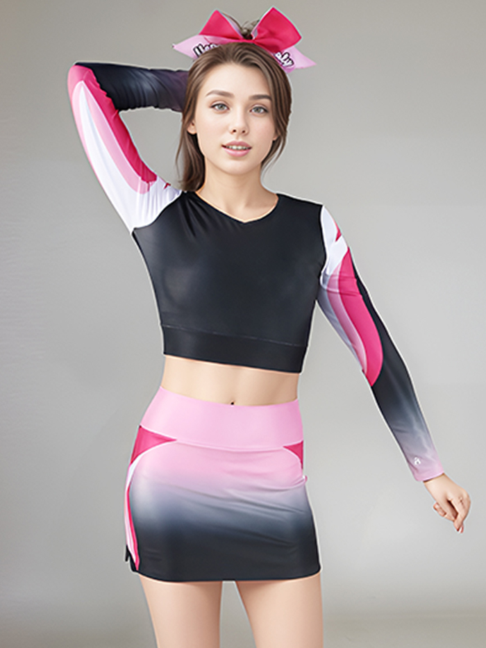 Step up your team’s game with the DS001 Healy Edition Cheer Uniform, a high-performance 3-piece set that gives you a sleek layered look with full flexibility. This set includes a long sleeve crop top worn underneath a bold sleeveless tank, plus a matching fitted ombré skirt — giving your squad a sharp, on-brand appearance without compromising comfort.