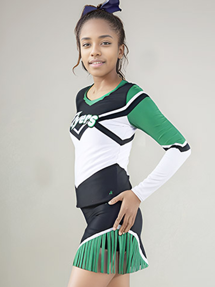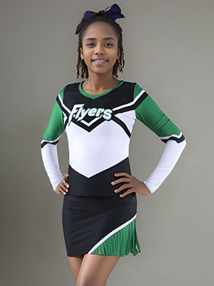 Step onto the floor with bold confidence in the DS009 Flyers Edition Cheer Uniform, a timeless long sleeve cheer set built for strength, spirit, and visual impact. This set features a striking green, white, and black color block design with a sublimated “Flyers” team logo across the chest and sharp V-shaped detailing for added depth and motion.