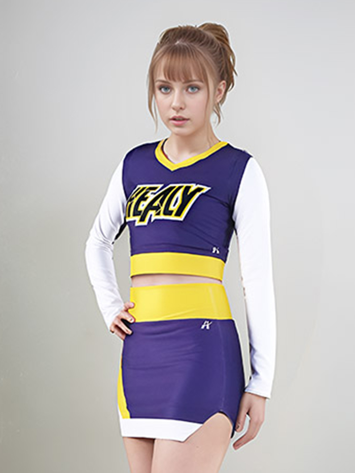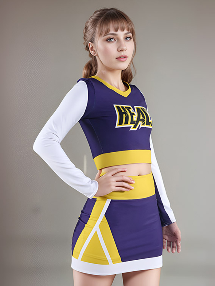 Lead your squad with confidence in the DS010 HEALY Cheer Uniform, a dynamic long sleeve uniform set designed for top-tier performance and bold style. Featuring a vibrant purple and gold color scheme, crisp white sleeve accents, and a powerful HEALY tackle-twill style sublimated logo, this uniform brings together tradition and modern flair.