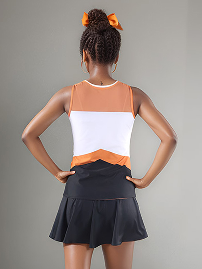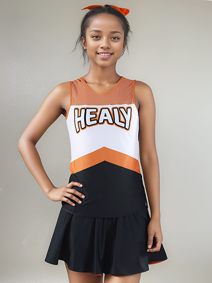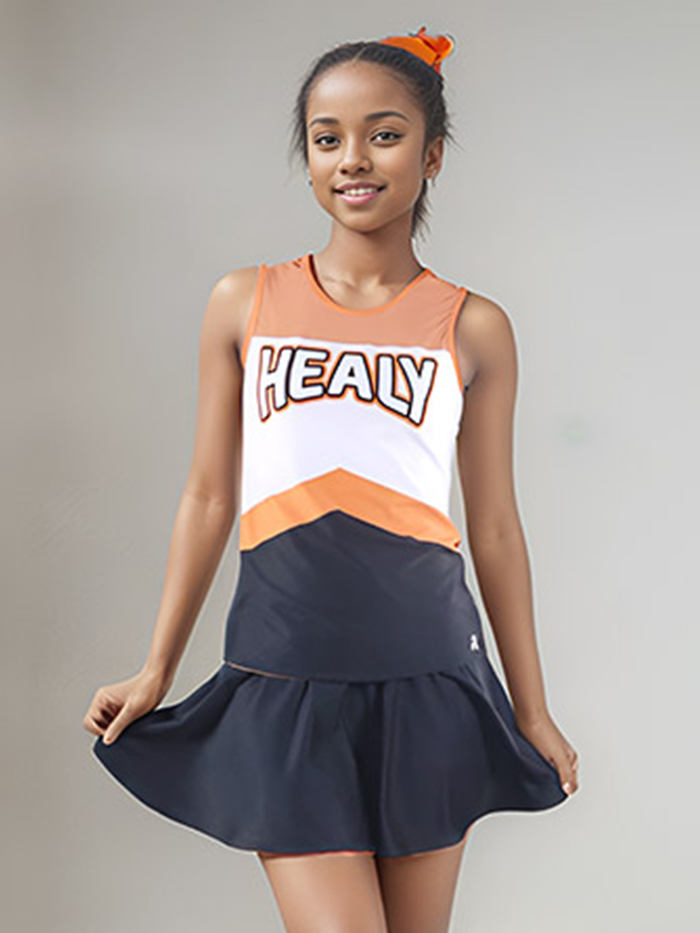 Radiate team pride in the DS011 HEALY Edition Cheer Uniform, a fun and functional 2-piece set perfect for spirited performances, pep rallies, and team events. Featuring a vibrant orange, white, and navy color block design, this sleeveless top keeps athletes cool and confident, while the coordinating navy pleated skirt adds movement and flair with every stunt.