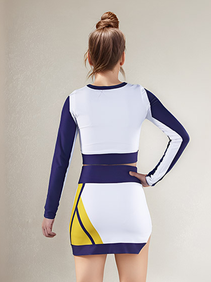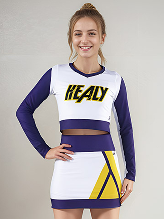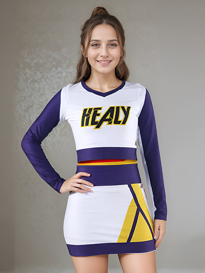Showcase your team’s energy with the DS014 HEALY Edition Cheer Uniform, a sharp long sleeve set designed to combine comfort, color, and performance. Featuring a powerful purple and yellow color block design on a crisp white base, this 2-piece uniform includes a long sleeve crop top and coordinating fitted skirt — both with high-performance sublimated graphics for a clean, fade-free finish.