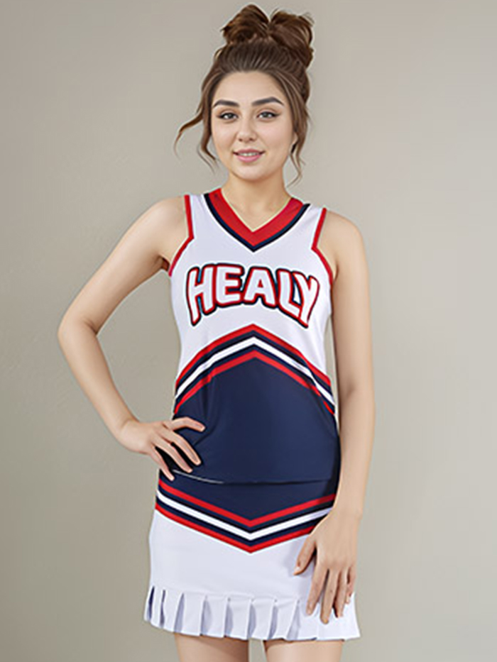 Cheer in timeless tradition with the DS018 HEALY Edition Cheer Uniform, a bold and clean sleeveless uniform set made for high performance and standout team pride. Featuring a white base with bold navy and red chevron striping, this 2-piece set includes a sublimated HEALY logo top and a matching white pleated hem skirt for a crisp, confident look from pep rallies to game day.