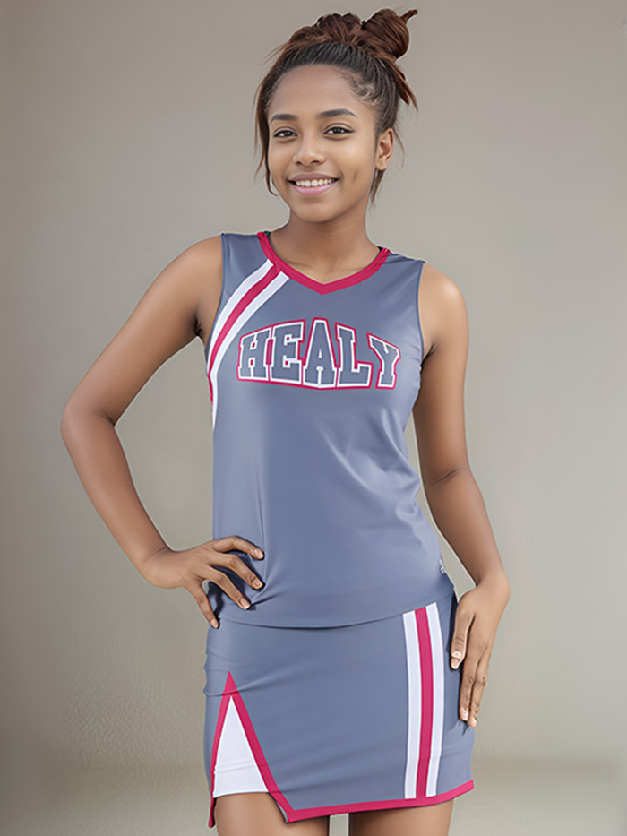 Show your team pride with the DS027 HEALY Cheer Uniform, a stylish 2-piece sublimated set that blends modern minimalism with classic athletic flair. Featuring a slate gray base accented with white and hot pink striping, this sleeveless cheer top and coordinated skirt combo delivers both form and function.