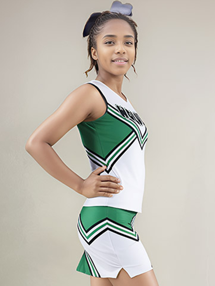 Clean lines, bold colors, and unbeatable comfort — the DS030 WOLVES Cheer Uniform brings your team’s pride to the spotlight. Featuring a striking green and black chevron design against a crisp white base, this style is a standout on the sidelines or the mat.