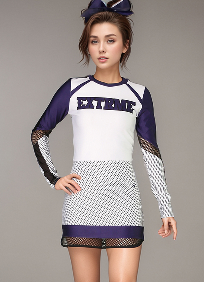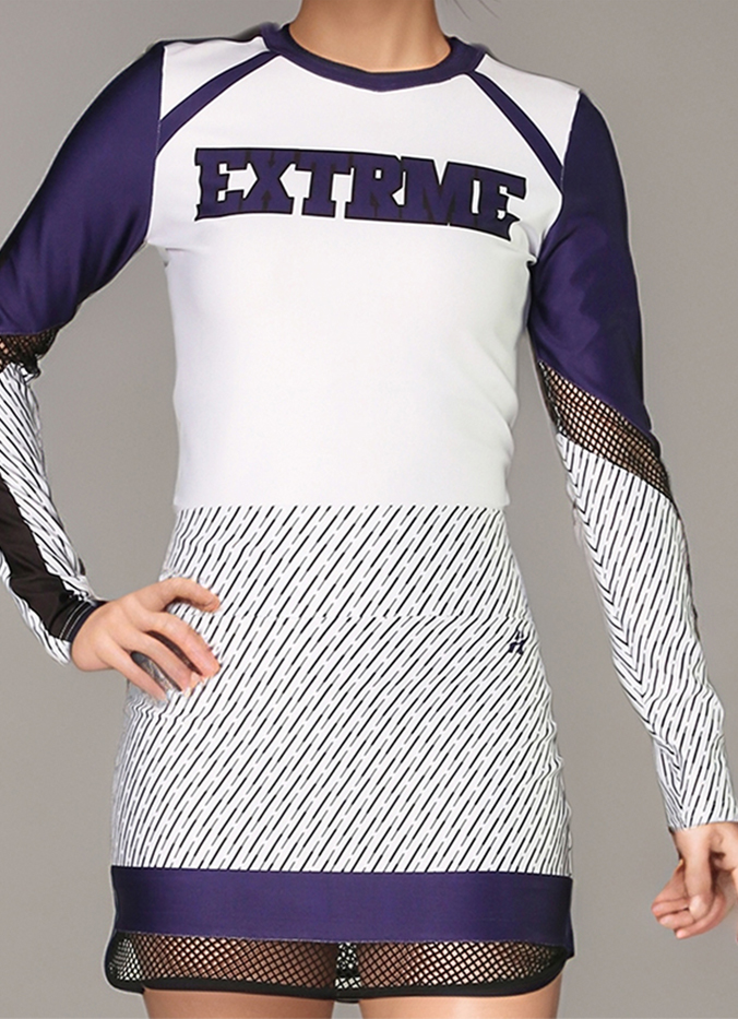 Make a bold statement in the DS042 cheerleading uniform – where edgy meets performance. This full-length, long-sleeve uniform features a sleek black-and-white geometric print with bold purple accent panels. The mesh panel inserts on the sleeves and hem add breathable function and sporty flair, while the open-back detail gives it a modern twist. Designed with stretch performance fabric to keep up with every move, this style brings both fashion and function to the mat.