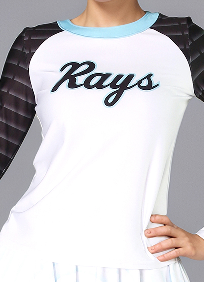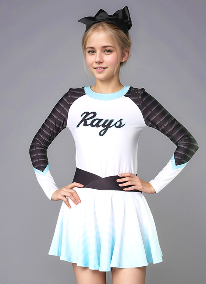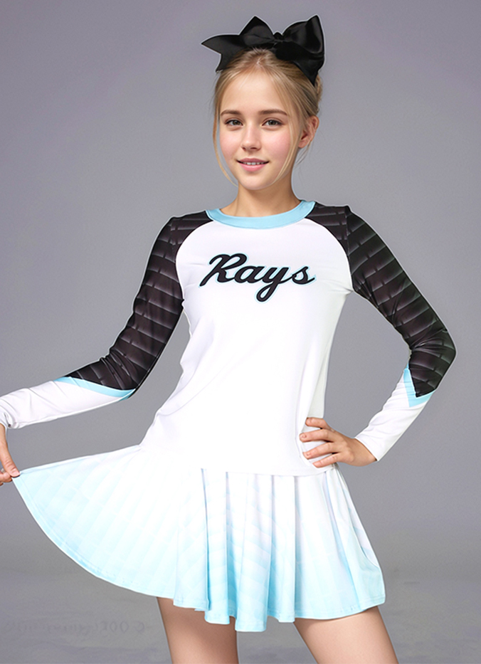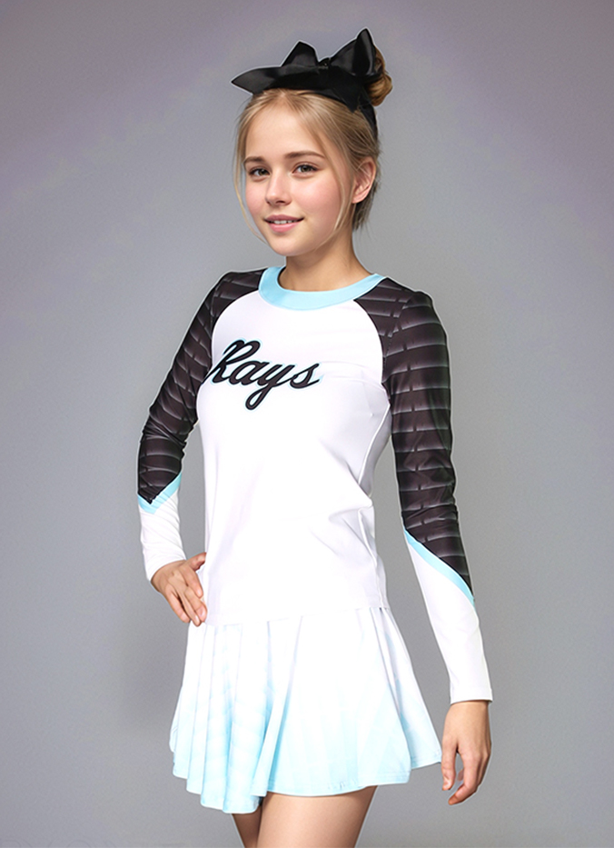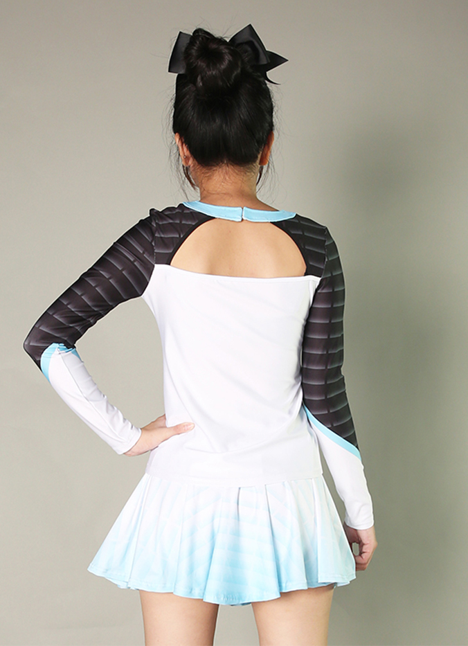 Step into your next performance with elegance and confidence in the DS044 Cheerleading Uniform. This full-length, long-sleeve uniform features a soft white base that flows into a stunning sky blue ombre pleated skirt. The sleek black textured sleeves and bold back cutout offer a modern touch, while the high-stretch fabric ensures freedom of movement and comfort during every routine.
