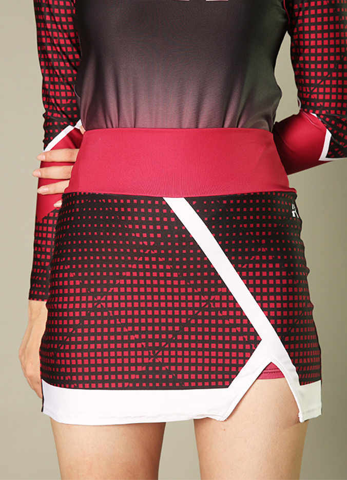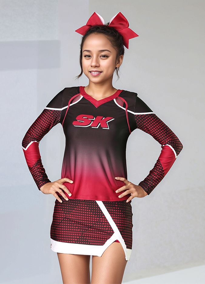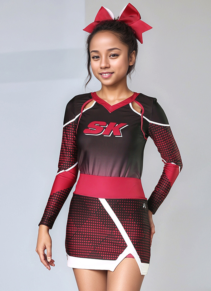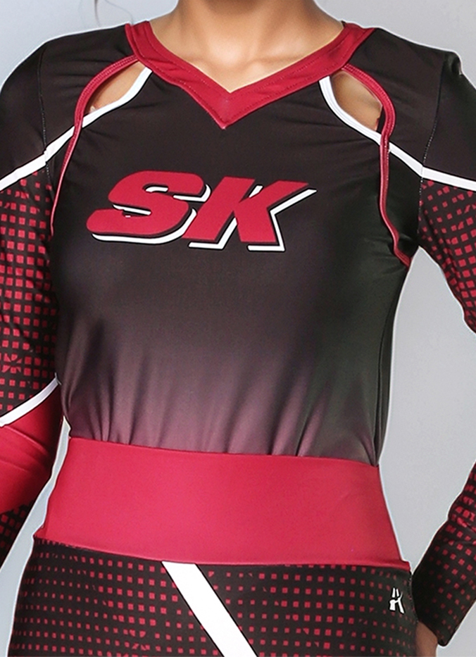 Stand out on the sidelines in this bold and fierce custom cheer uniform. Featuring a gradient black-to-red sublimated print, eye-catching geometric paneling, and dynamic shoulder cutouts, this long sleeve top brings both performance and attitude. Paired with a matching asymmetrical skirt featuring contrast piping and custom patterns, this look is perfect for high-energy routines.