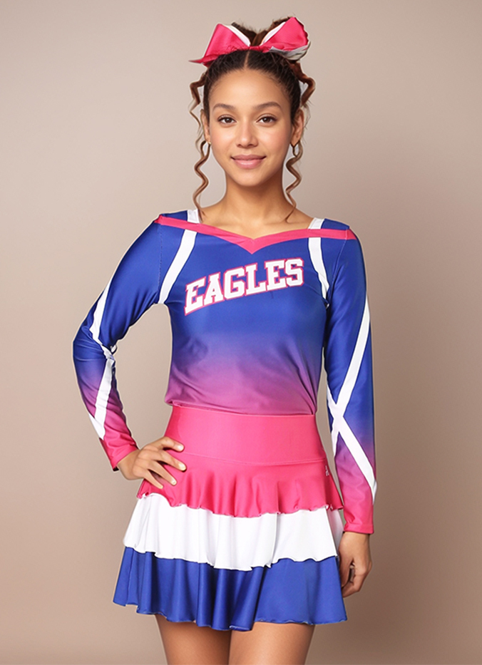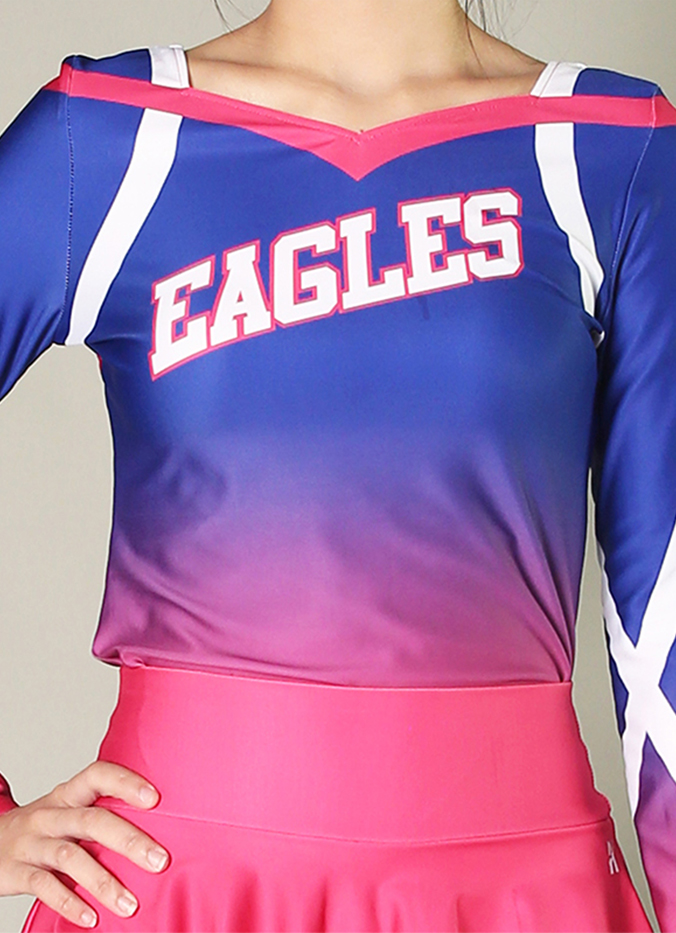 • Top: Smooth dye-sublimated gradient from deep blue to pink, accented by white crisscross striping on the sleeves and neckline. Bold “EAGLES” lettering pops across the chest for strong team presence.