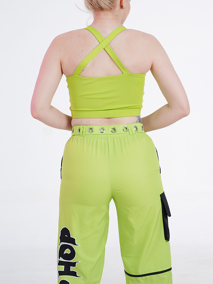 Matching joggers with black cargo pockets, belted waistband, and “HIP HOP” leg print for urban edge.