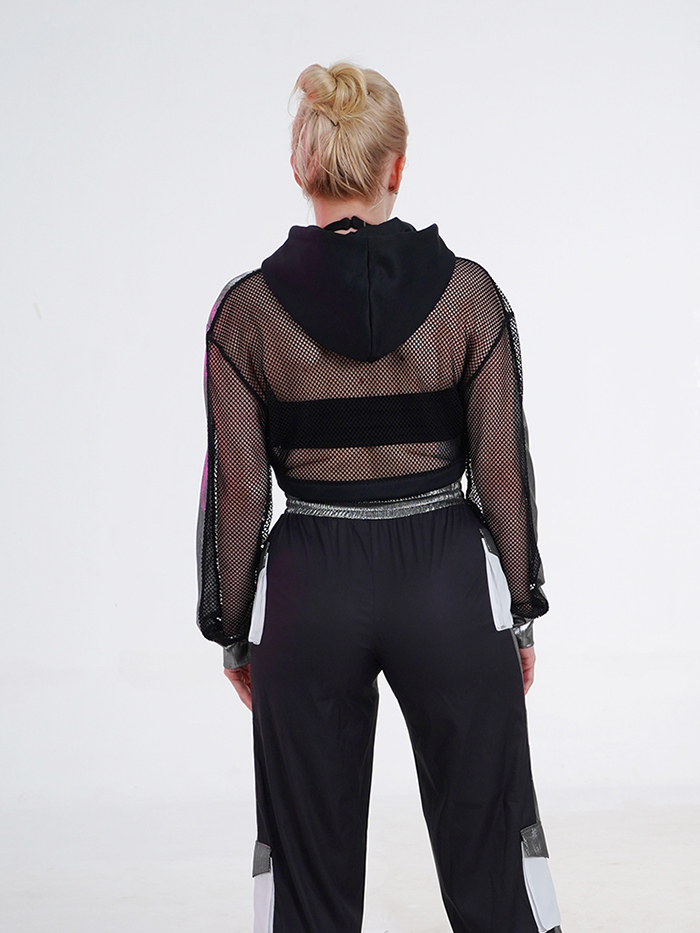 A black mesh hoodie with metallic silver cuffs and trim, perfect for layering and stage shine,