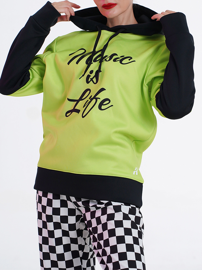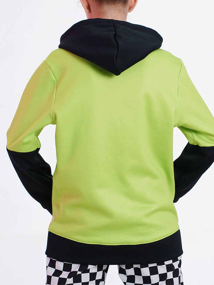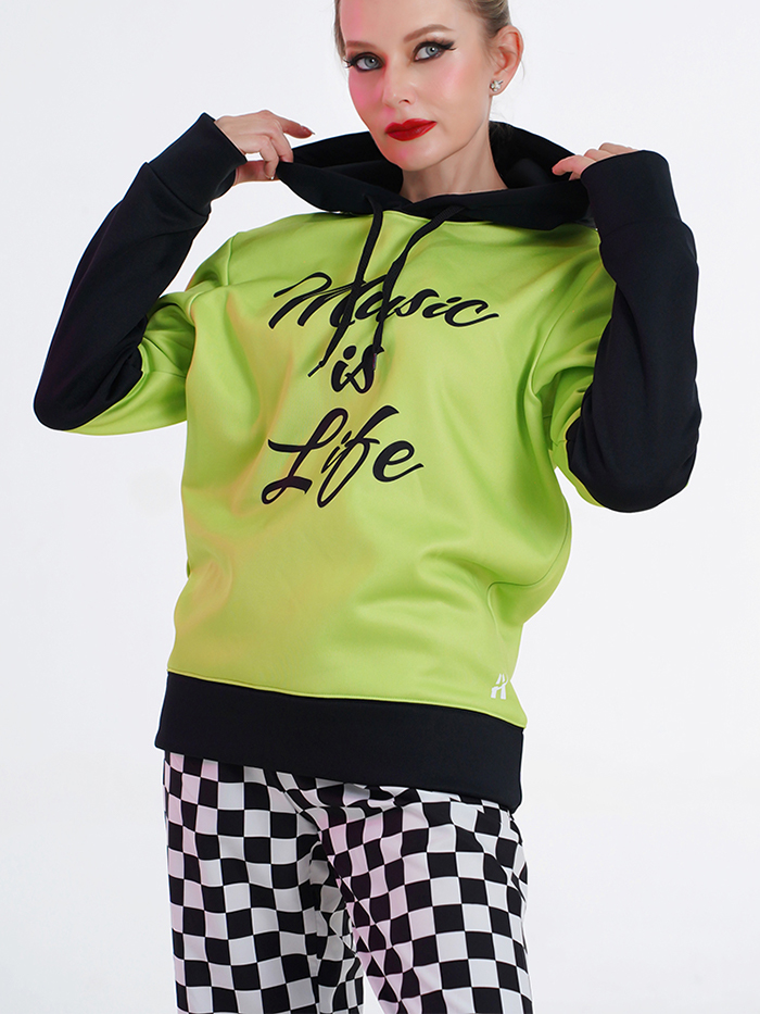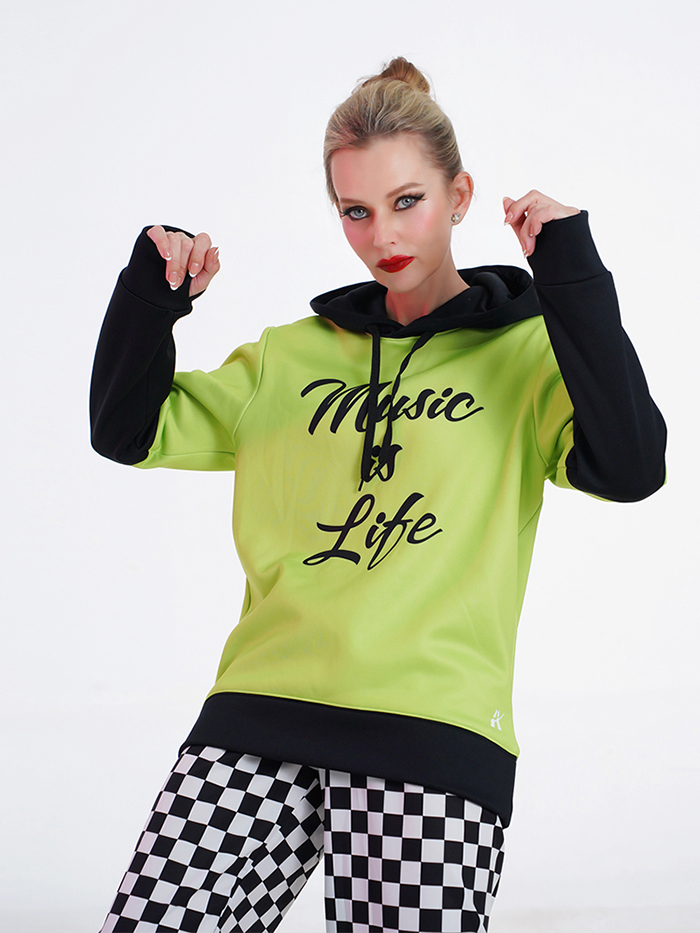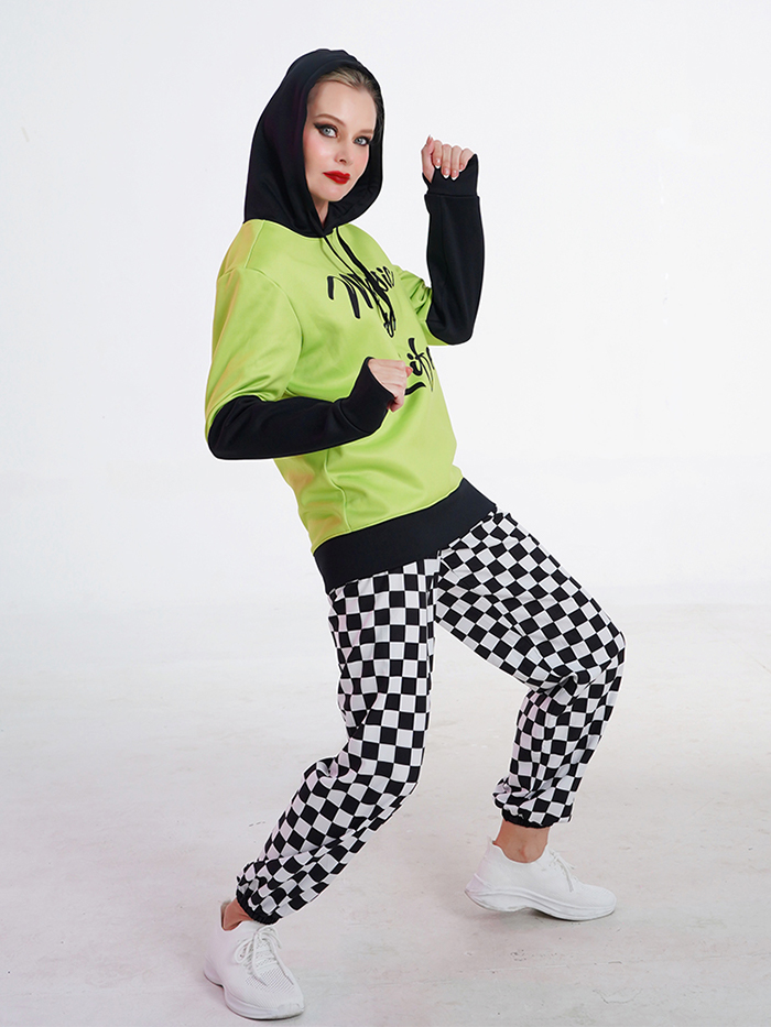 Step into the spotlight with our bold checkerboard dancewear set, designed for high-energy performances and street-style confidence. Featuring a lime green hoodie with contrasting black sleeves and statement lettering, this outfit is paired with classic black-and-white checkered joggers that scream movement and rhythm. The elastic cuffs and waistband ensure comfort during intense routines, while the vibrant color palette guarantees you’ll stand out.