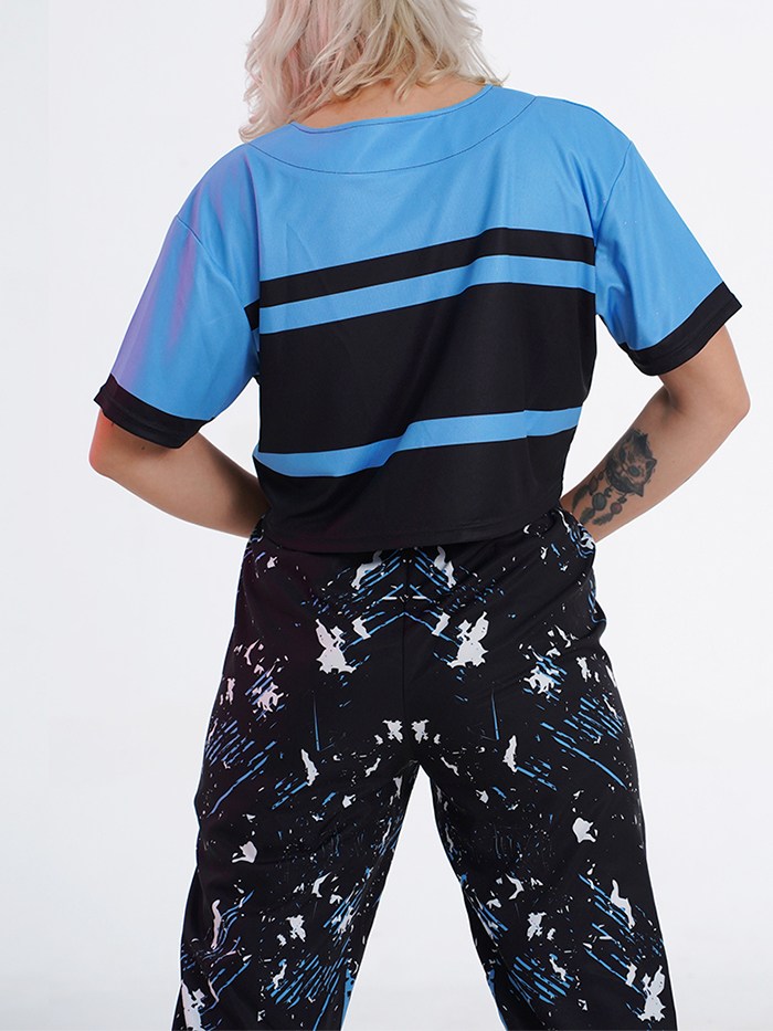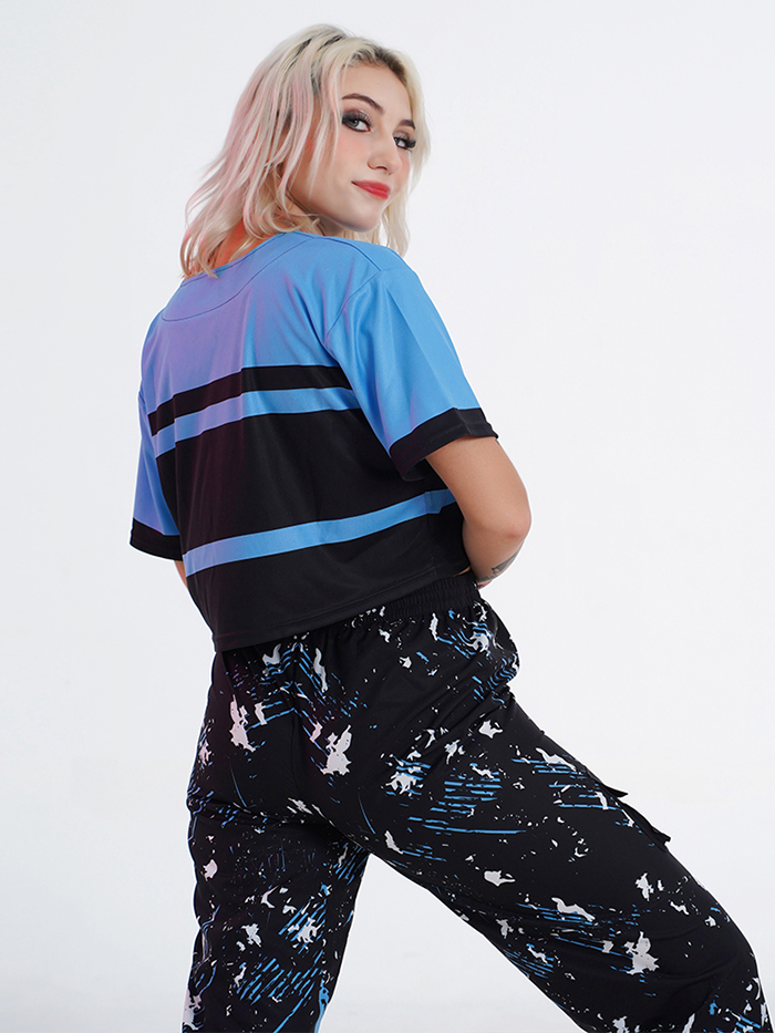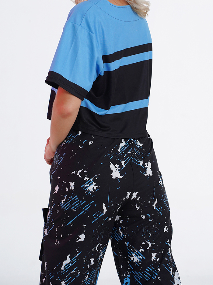 Make a bold statement in our HU014 Urban Pop Set, designed for hip hop dancers who live to stand out. The cropped baseball-style top in black and electric blue gives athletic vibes, while the splatter-patterned joggers bring high-energy streetwear drama. Utility cargo pockets add function to fashion, making this set perfect for both stage and street. Ready to pop, lock, and slay.