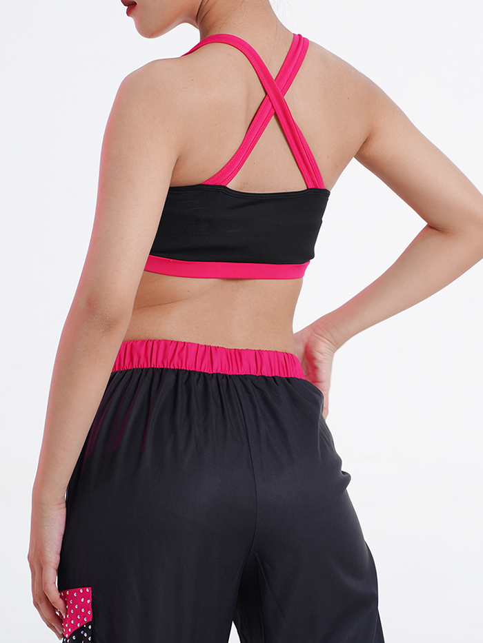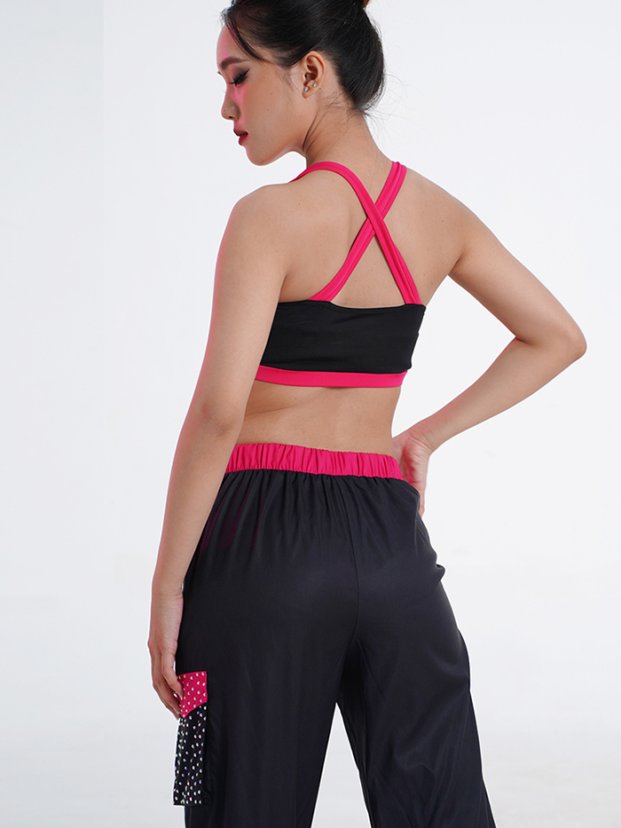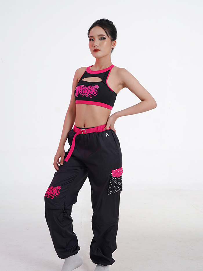 This Hip Hop outfit blends power and fun with a striking black-and-hot-pink design. The crop top features a halter-style neckline with a front cut-out and bold “Patrick” graffiti print, while the crisscross back straps add extra support and streetwear style. Paired with relaxed jogger pants, detailed with a pink belt, logo print, and a polka-dot patch pocket, the look is full of personality and movement. Lightweight and durable, this set is perfect for performances, training, or anyone ready to stand out with confidence.