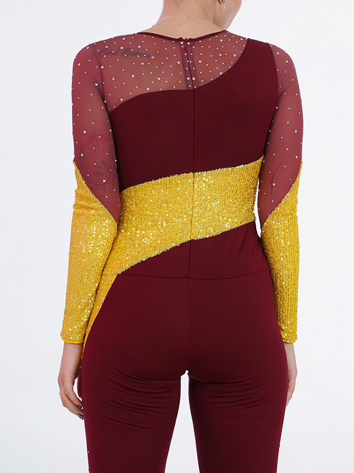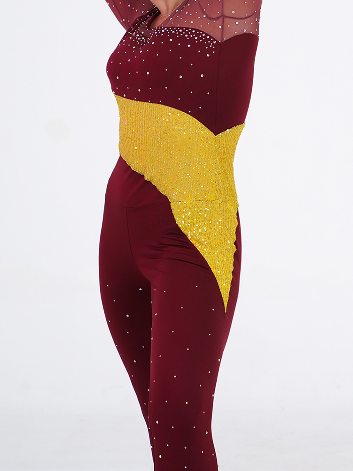 This dazzling jazz dance bodysuit is designed to shine with sophistication and power. The rich burgundy base is contrasted with a diagonal gold sequin panel that wraps around the body, adding a striking stage effect. Rhinestones are scattered across the mesh upper bodice, sleeves, and legs, catching the light beautifully during movement. The fitted silhouette with long sleeves and full-length legs ensures both elegance and comfort, making it ideal for jazz, lyrical, or contemporary performances.