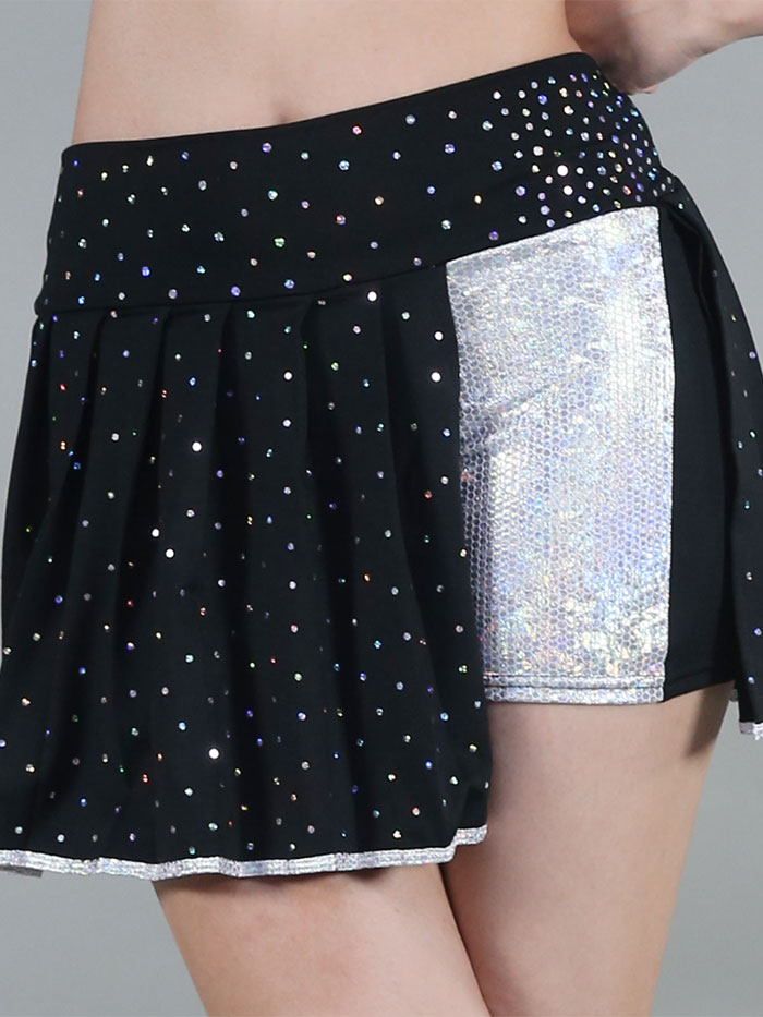 Shine bright and move freely with the JD002 jazz dance set, featuring a shimmering silver sequin sports bra paired with a flowing black overlay skirt. Designed to dazzle under stage lights, the skirt is dotted with spangles and detailed with a holographic side panel that pops with contrast. Lightweight, stretchy, and bold—this set is perfect for jazz routines, hip-hop, or team performances where sparkle and sass meet performance.