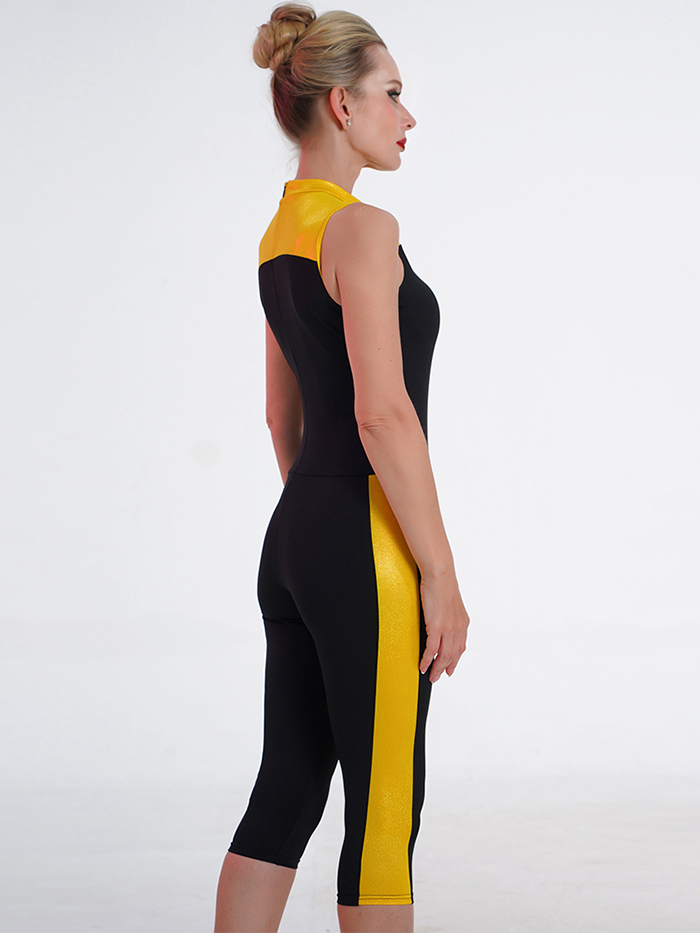 This striking jazz dance uniform combines strength and elegance with its bold black-and-gold color block design. The sleeveless high-neck top features shimmering golden panels that flow seamlessly into the side stripes, creating a sleek silhouette that enhances movement and stage presence. The three-quarter length legs add a sporty, contemporary touch while keeping the look dynamic and stylish. Made from stretchable, breathable fabric, this uniform ensures full comfort, flexibility, and confidence for any performance.