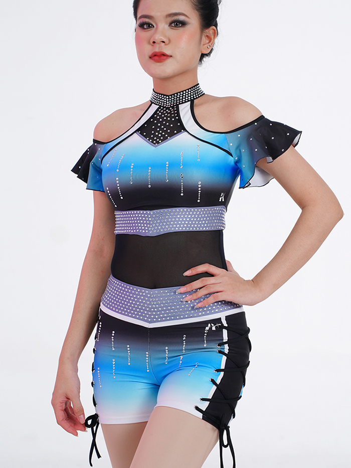 This modern jazz dance uniform features a stunning blue-to-black gradient with shimmering rhinestone embellishments, designed to sparkle on stage. The cold-shoulder top has flutter sleeves and a rhinestone choker neckline for a chic, elegant finish. A mesh midsection adds a bold touch, while the high-waisted shorts are detailed with rhinestones and side lace-up ties for both style and adjustability. Made from lightweight, stretchable fabric, this set ensures comfort and flexibility, making it perfect for jazz, lyrical, or team performances.
