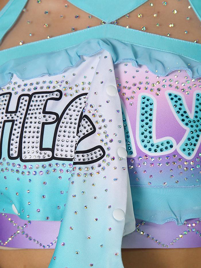 Skirt: Reversible skirt with matching ombré gradients and rhinestone embellishment on both sides – flip between soft pastels or alternate team tones in seconds.