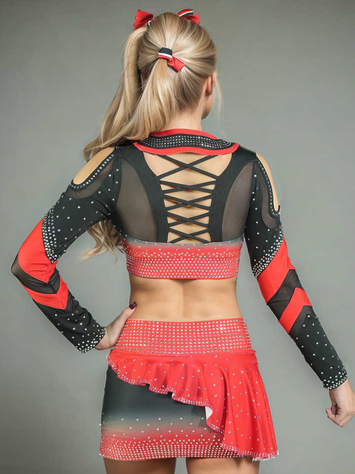 Fierce, fiery, and designed to perform — the LAS046 LUX Allstar Cheer Uniform delivers standout style with a competitive edge. Featuring red-to-black ombré fades, premium rhinestones, and bold mesh and cutout accents, this set was made to light up the mat with power and polish.