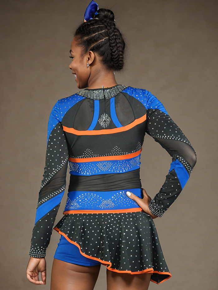 Skirt: Asymmetrical flared skirt with rhinestone scatter throughout, orange trim, and matching blue undershorts. Rhinestone-covered waistband creates a clean, secure finish that shines through the routine.