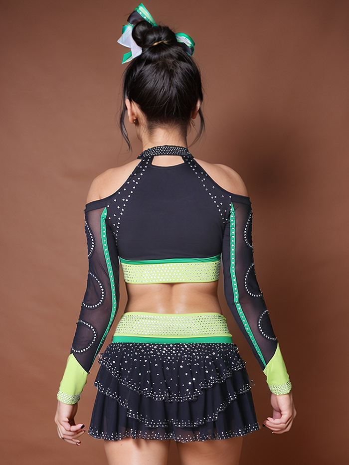 Skirt: Triple-tiered black ruffle skirt with rhinestone edging on each layer and a wide lime green sparkle waistband for extra shine and support. A built-in brief ensures coverage through full routines.