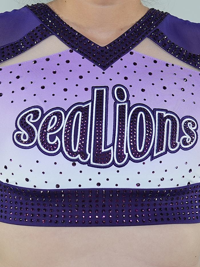 Grace meets power in the SeaLions Lux All-Star Cheer Uniform, where elegant ombré hues blend effortlessly with show-stopping sparkle. This style features a soft lavender-to-white fade with high-density rhinestone detailing across the top, sleeves, and waistband.