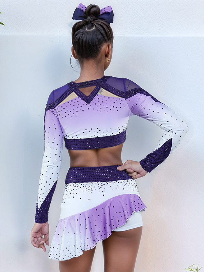 The structured crop top showcases mesh shoulder cutouts and deep purple rhinestone trim, while the asymmetric ruffle skirt adds a playful twist. Engineered with flexible 4-way stretch fabric, this uniform offers a flattering fit and full range of motion — perfect for athletes who want to shine with confidence and poise.