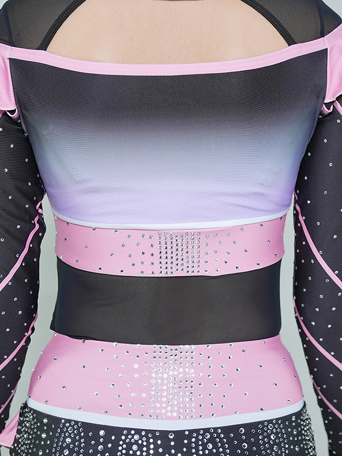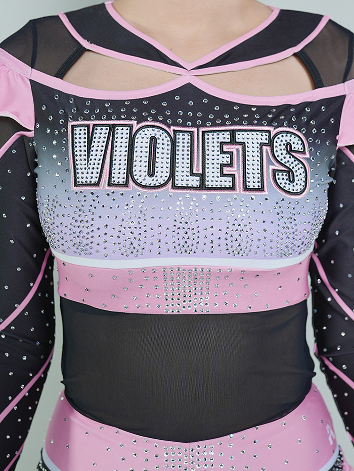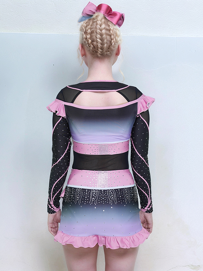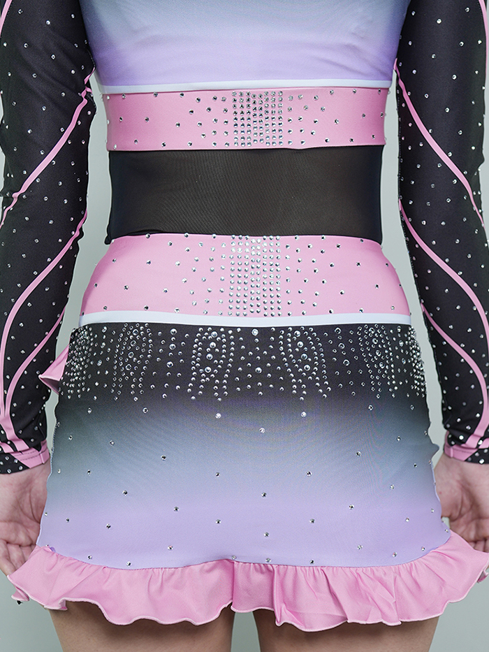 Soft meets strong in the Violets Lux All-Star Cheer Uniform — a beautifully blended design featuring delicate ruffle accents, a sleek mesh midsection, and radiant rhinestone sparkle. The color scheme transitions gracefully from pastel lilac to soft black, with pink trim highlighting the shoulders, waist, and flutter skirt.