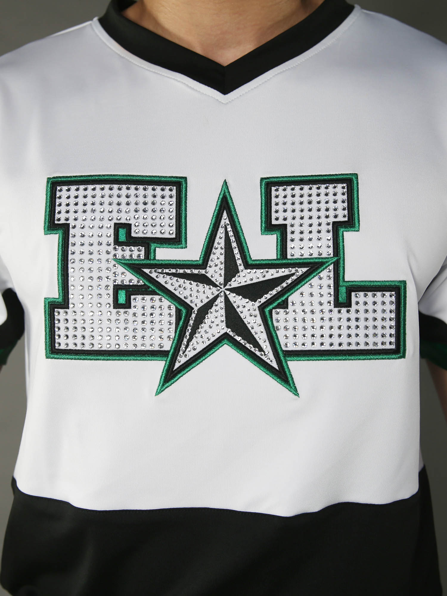 Top type shown: V-neck short-sleeved shirt with rhinestones on the sleeves