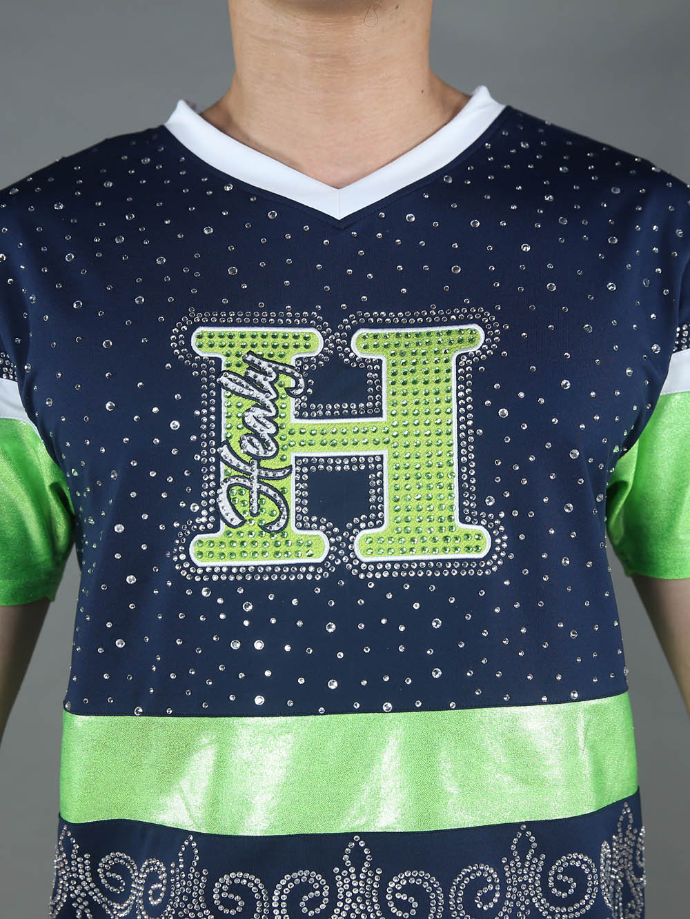 Top type shown: V-neck short-sleeved shirt, unique rhinestone detailing, full of blings