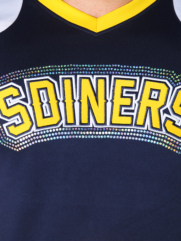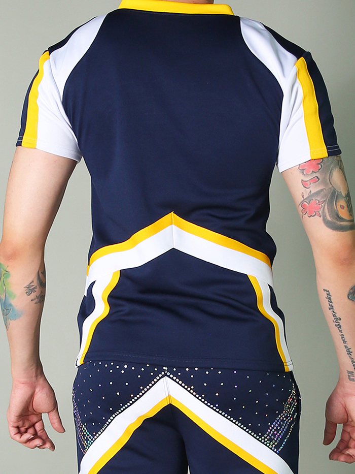 Stand strong and shine bright in the MCU028 Male Cheer Uniform – a bold, structured look designed for elite cheer teams. This navy blue short sleeve top features white and gold chevron detailing with a bold “SDINERS” team name outlined in shimmering spangles. Coordinated pants feature matching chevron patterns and scattered spangles around the hips for a sharp, athletic finish. Built for strength, comfort, and team pride on every performance.