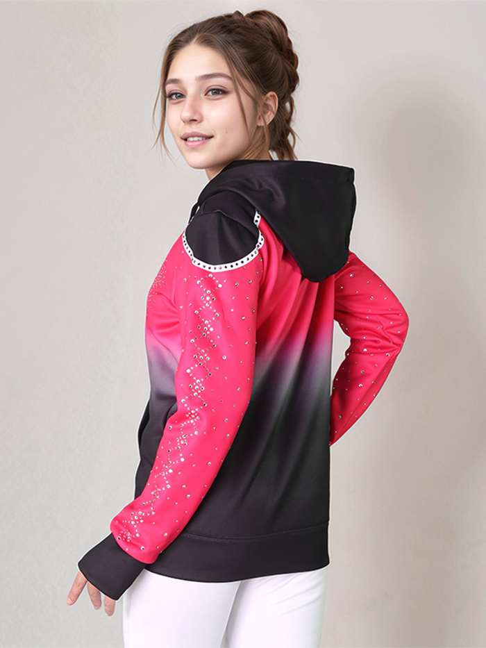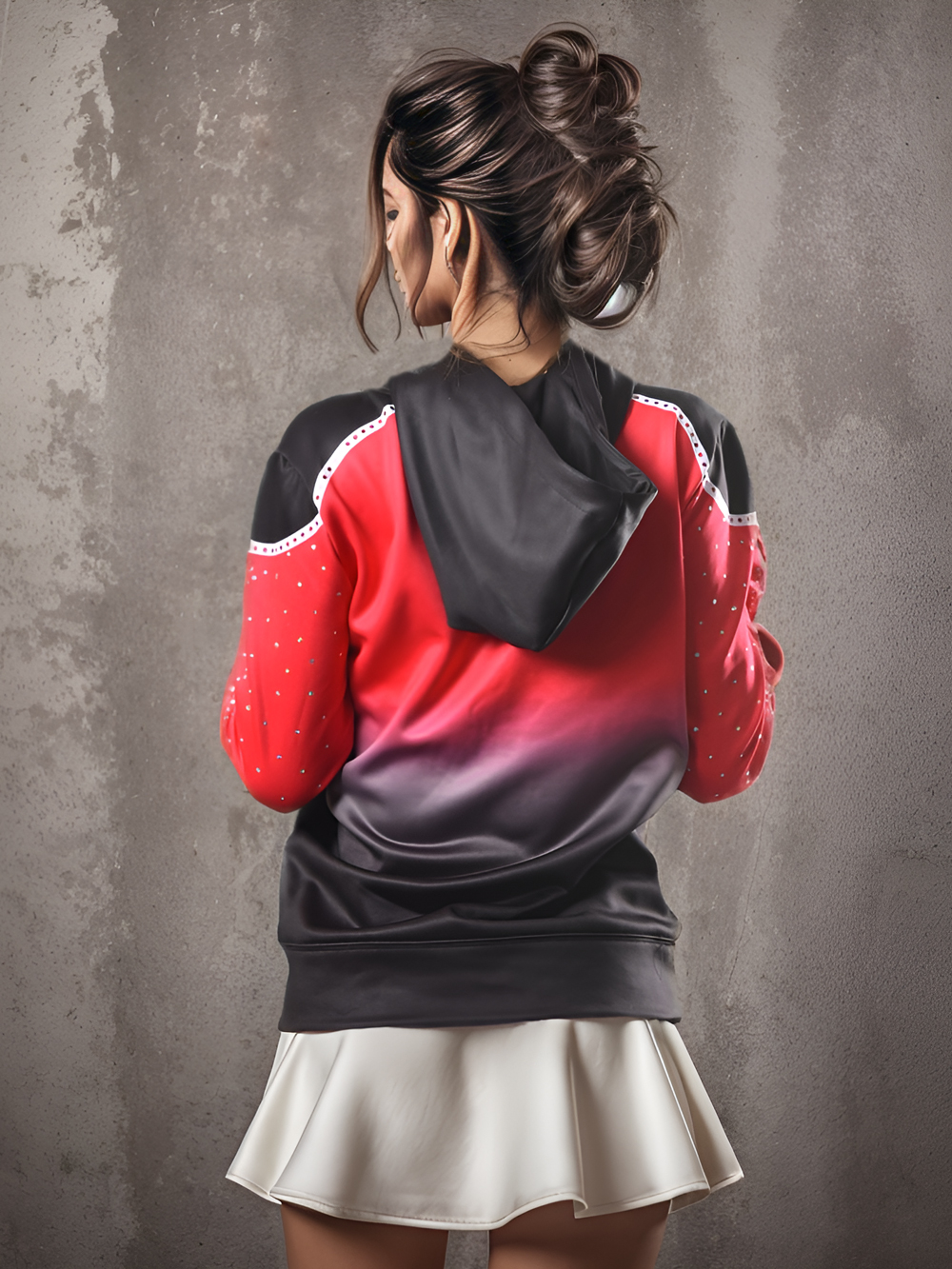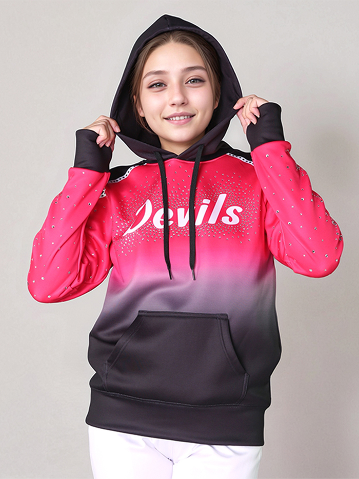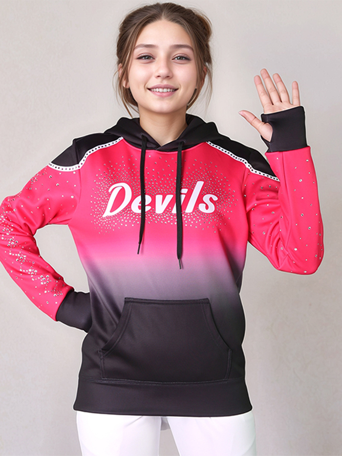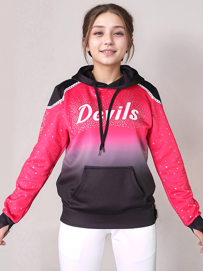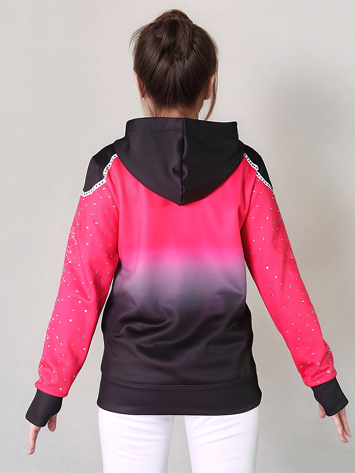 An ultra-soft, unique addition to your hoodie rotation. Take it on-the-go or to the gym to show off those guns. This long-sleeved pullover hoodie features front pockets and spangles on the end of the sleeves, ombre design. Mix and match with other styles to complete the look.