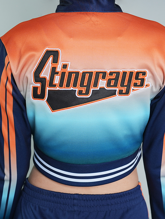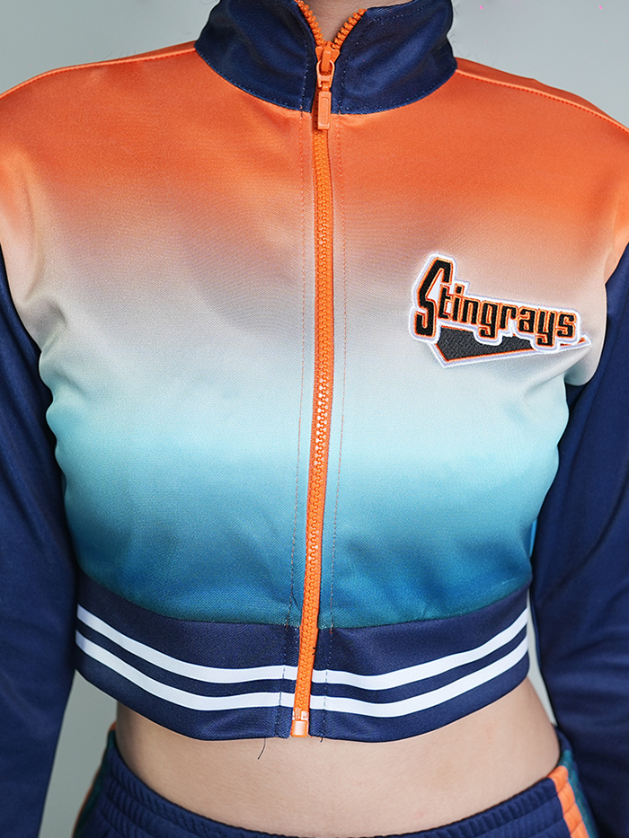 Make a bold sideline statement with the WU025 Warm-Up Suit — where modern fashion meets cheer performance. This stylish two-piece set features a cropped zip-up jacket with a striking ombré fade from orange to teal, complete with sporty striped cuffs and waistband. The pants complement the look with coordinating side stripes and a comfortable, tapered fit.