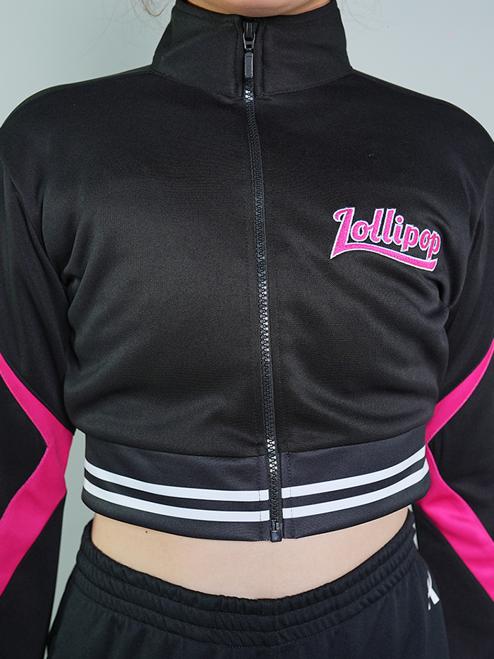 Make a fierce impression with the WU029 Cropped Cheer Jacket — a sassy twist on traditional warm-ups. This jacket features a sleek black body with pink ombré sleeve panels, varsity-style striped hem, and a standout pink lips graphic on the back for extra attitude. The front showcases a custom “Lollipop” team logo and a cropped silhouette for stylish layering over practice wear or performance sets.