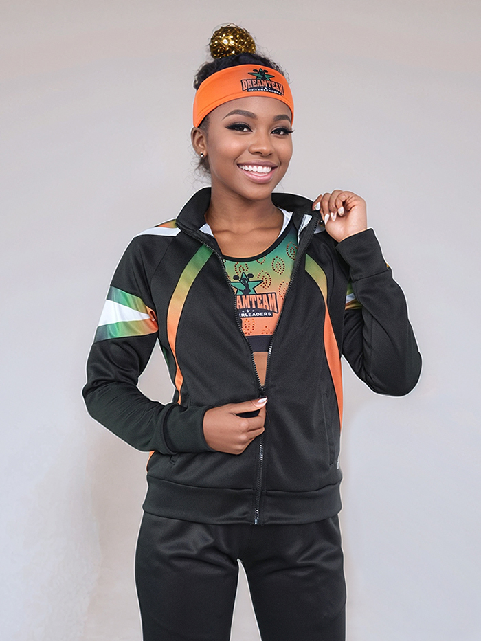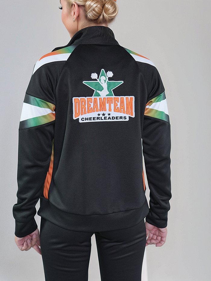 The WU032 DreamTeam Full-Zip Jacket delivers the ultimate mix of team pride and sporty edge. Designed with sleek black performance fabric, this jacket features bold orange-green-white gradient stripe panels on the sleeves and shoulders, plus a custom embroidered front logo and a large full-back team emblem for standout spirit.