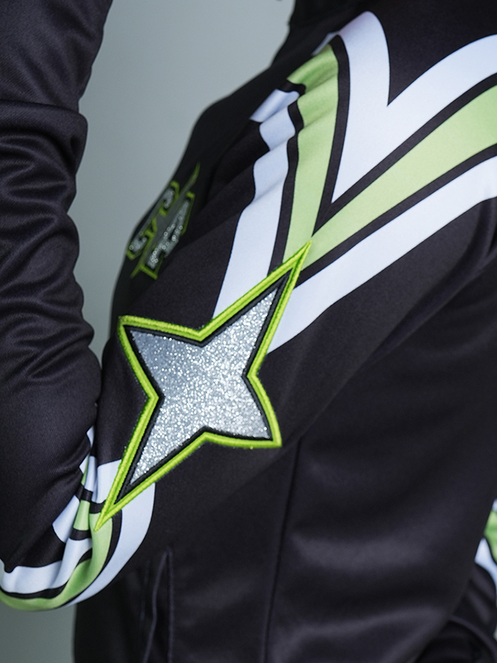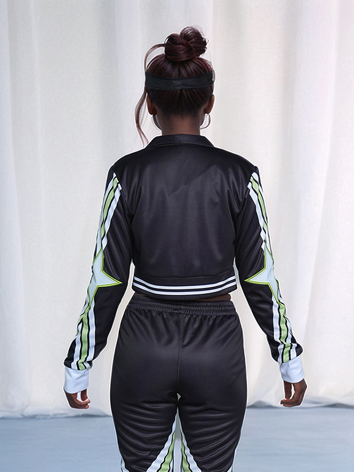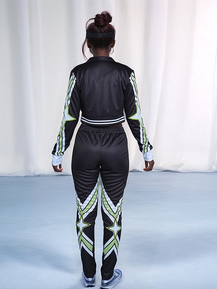 The WU038 Warm-Up Set is made for teams who lead with flair. This performance-ready look features a cropped zip-up jacket with striped waistband and cuffs, paired with sleek jogger pants. Both pieces are decorated with bold green and white star graphics running down the sleeves and legs for maximum impact. The chest showcases the team’s “CA” logo, while the full set keeps your squad looking fierce from arrival to competition.