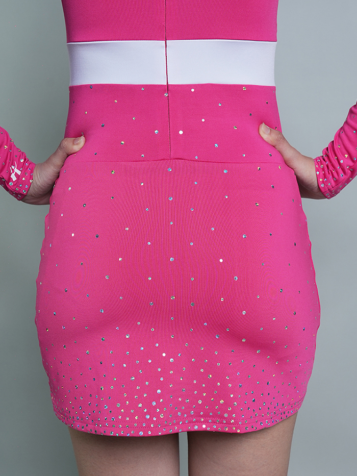Bring the perfect mix of sass and sparkle with the School Dance Dress SDU007. This vibrant hot pink dress features an eye-catching cold shoulder design, contrasted by white chevron panels and mesh inserts for a sporty edge. The glitter “PANTHERS” team name takes center stage on the chest, while shimmering silver spangles are scattered from sleeves to hemline for a dazzling effect under the lights. Sleek and stretchy, this dress is made for confident movement and bold performances.