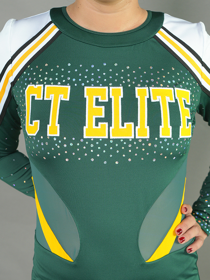 Show your school pride in style with the School Dance Dress SDU010 — a timeless cheer-inspired look with a modern edge. This forest green dress features crisp white and yellow contrast stripes down the shoulders and sleeves, paired with mesh panel details for breathability and movement. The “CT ELITE” team name stands boldly across the chest, surrounded by a burst of shimmering silver spangles that also trail down the sleeves for a sleek and spirited sparkle. Comfortable, athletic, and eye-catching — perfect for every performance moment.