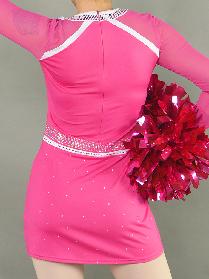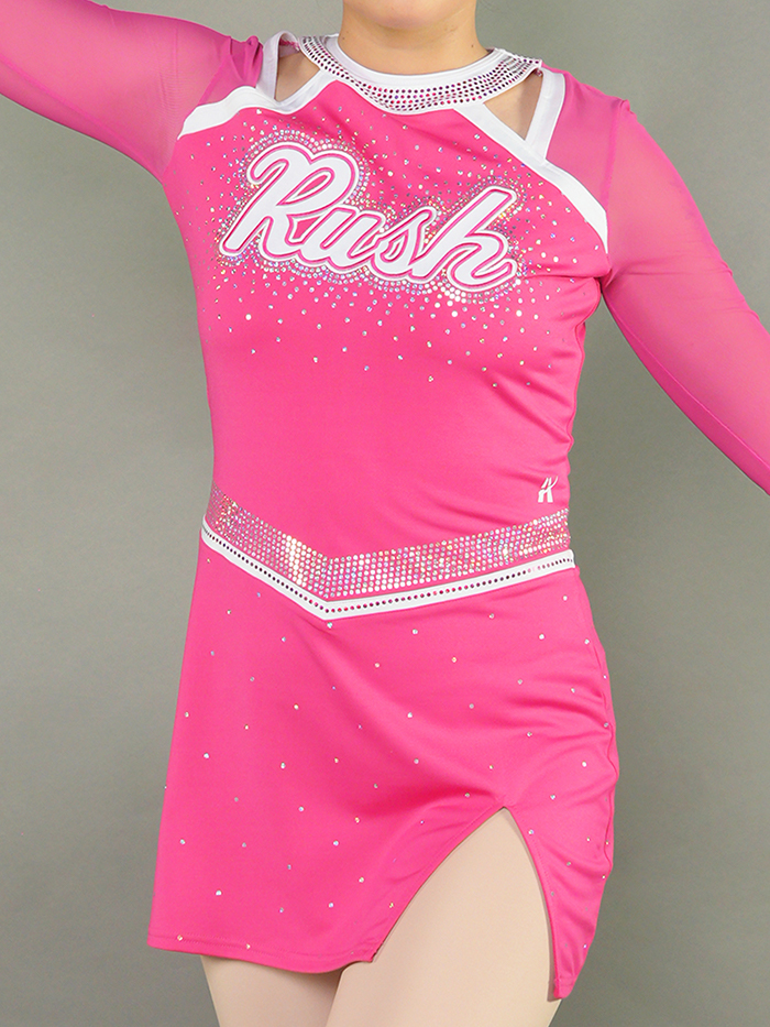 Bring the energy and sparkle with the School Dance Dress SDU011 — a bold and bright pink performance piece designed to shine on every move. Featuring long mesh sleeves, a crisscross neckline, and an angled skirt slit for flair, this design blends athletic edge with cheer glam. The “Rush” team name sparkles in glitter across the chest, while silver spangles shimmer across the bodice and skirt. A rhinestone belt adds a polished finishing touch, making this a standout look for sideline spirit and center stage moments.