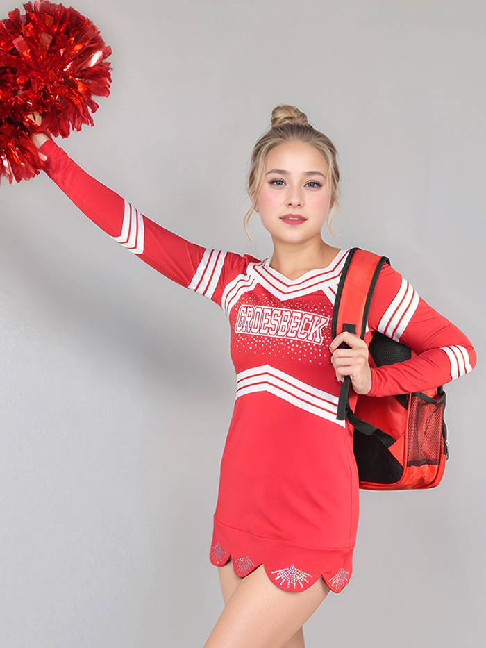 Bring the spirit in full color with the School Dance Dress SDU014 — a vibrant red cheer dress featuring timeless stripe details and dazzling accents. “GROESBECK” stands out in bold white block letters across the chest, surrounded by scattered silver spangles for radiant sparkle. The standout feature is the scalloped skirt hem, each curve beautifully accented with starburst-style spangle patterns for a playful yet polished finish. Long sleeves and angled waist stripes give this look a traditional cheer vibe with modern shine.