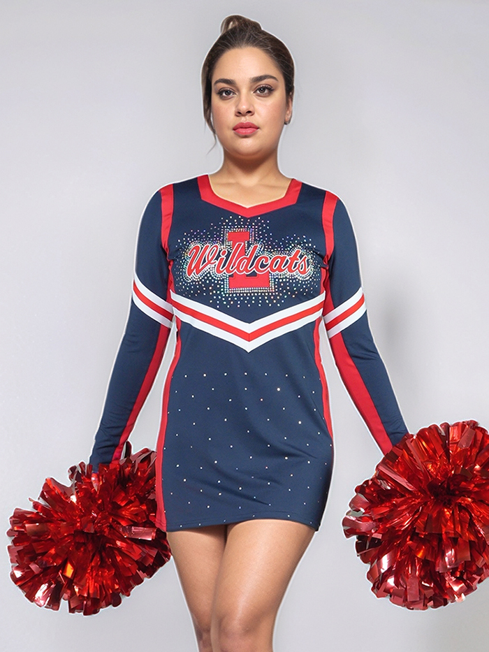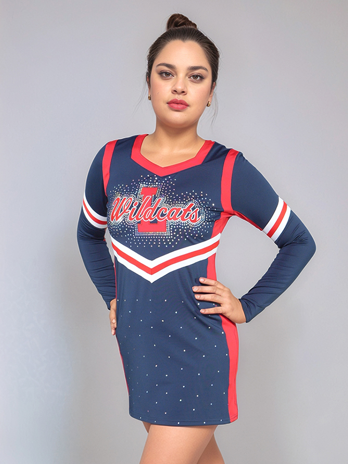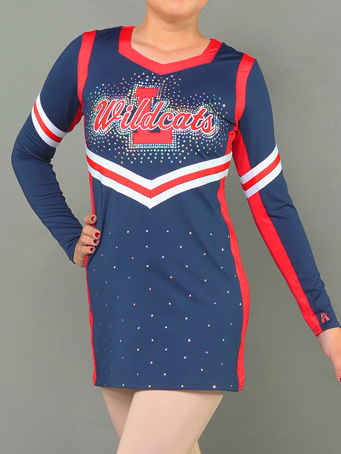 Show off your school pride with the School Dance Dress SDU016 — a powerful mix of tradition and sparkle. This navy long-sleeve dress features classic red and white varsity stripe accents along the chest, sleeves, and waist, perfectly framing the bold “Wildcats” team name on the front. Scattered silver spangles highlight the chest and flow down the skirt, catching the light with every step. With a fitted silhouette and stretch fabric, it’s ideal for performances that demand movement and impact.