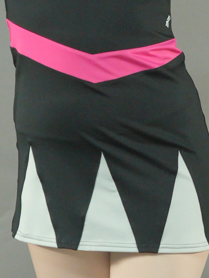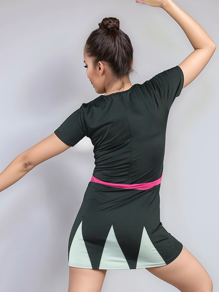 Bring the energy with the School Dance Dress SDU033 — a modern and playful dance look designed to turn heads. This black dress features bold mint triangle panels on the skirt and a hot pink waistband that adds vibrant contrast. The “ROYALTY” team name stands out in varsity-style lettering, surrounded by radiant silver spangles that shimmer with every move. Short sleeves and stretch performance fabric ensure full flexibility and comfort for high-energy routines.