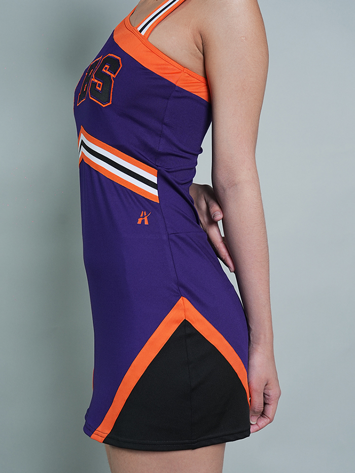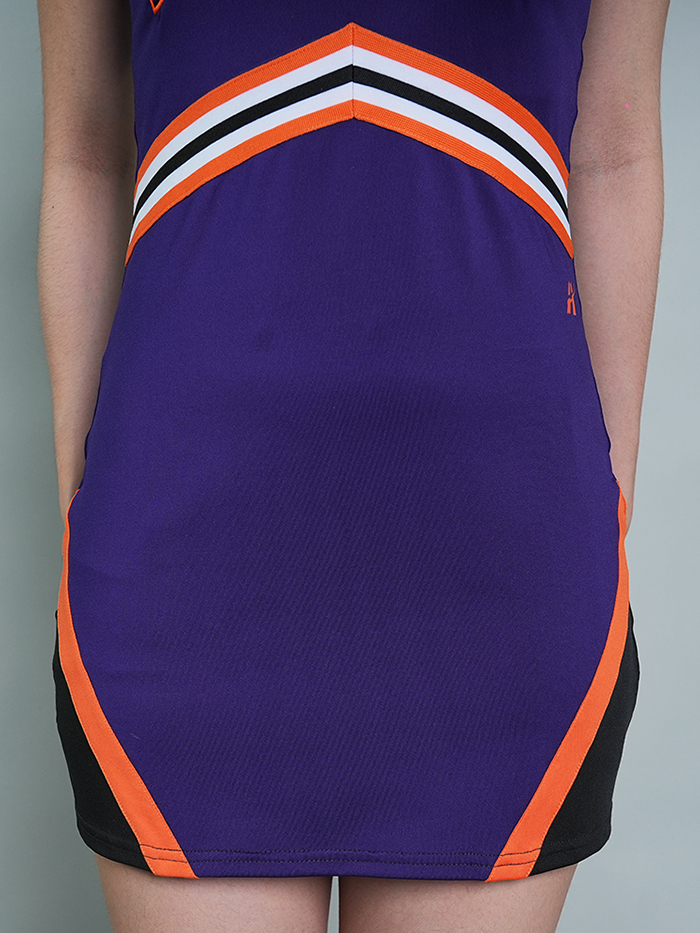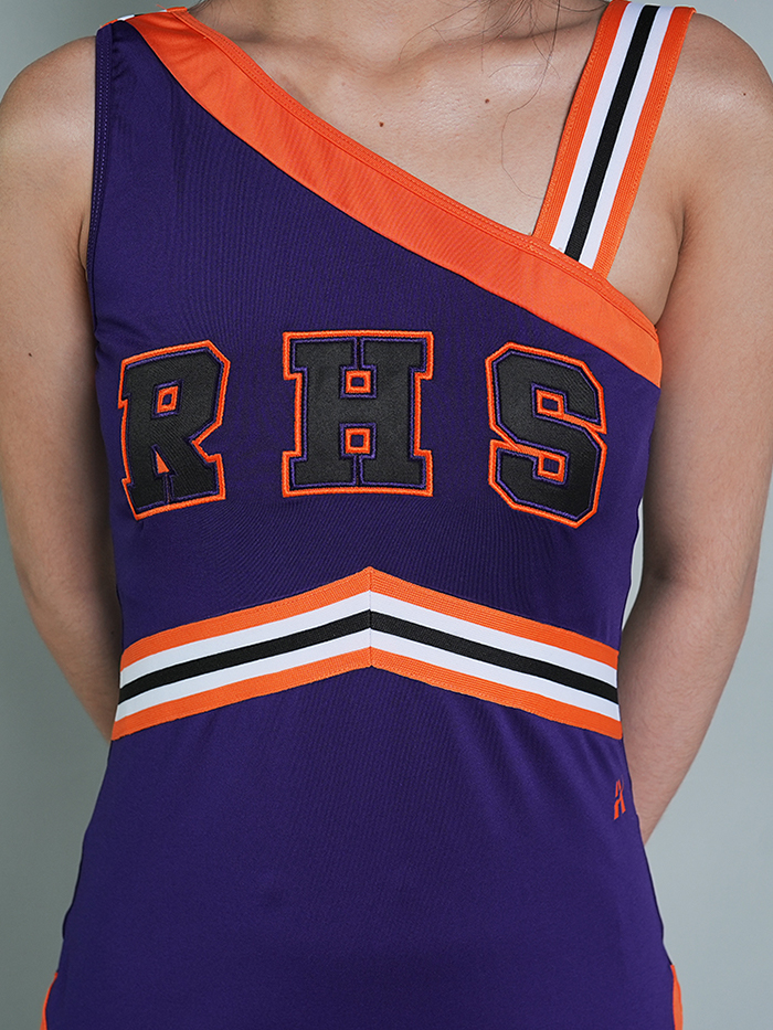 Bring energy and confidence to every routine with the School Dance Dress SDU050 — a dynamic one-shoulder design that blends classic varsity style with modern flair. This vibrant purple dress features orange and white stripe detailing across the bodice and hem, while sleek black side panels add definition and edge. The “RHS” team lettering pops across the front in bold varsity block font, and the stretch fabric ensures a comfortable, flexible fit for high-performance moments.