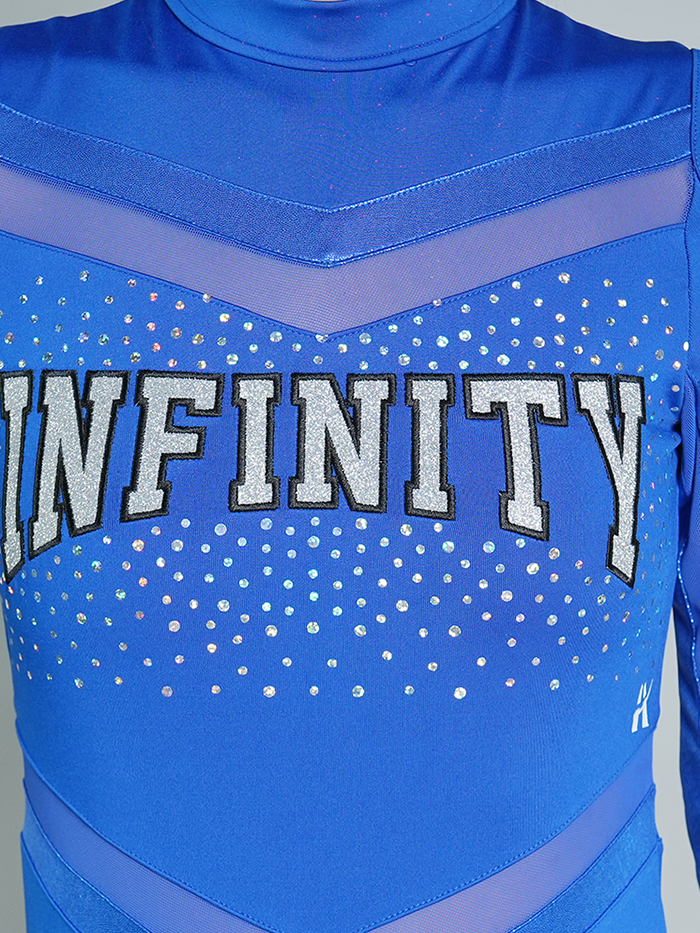 Step into the spotlight with the SDU001 “INFINITY” School Dance Uniform – a bold and modern leotard set designed to dazzle on stage and sideline. Crafted in a vibrant royal blue, this sleek design features shimmering spangles across the chest, bold tackle twill lettering, and cold-shoulder cutouts for a touch of edge. Sheer mesh paneling and metallic accents add dimension, while the detachable fitted skirt allows for quick changes between performance and practice.