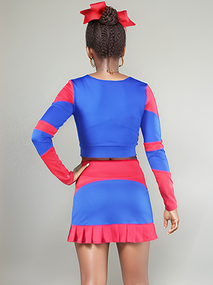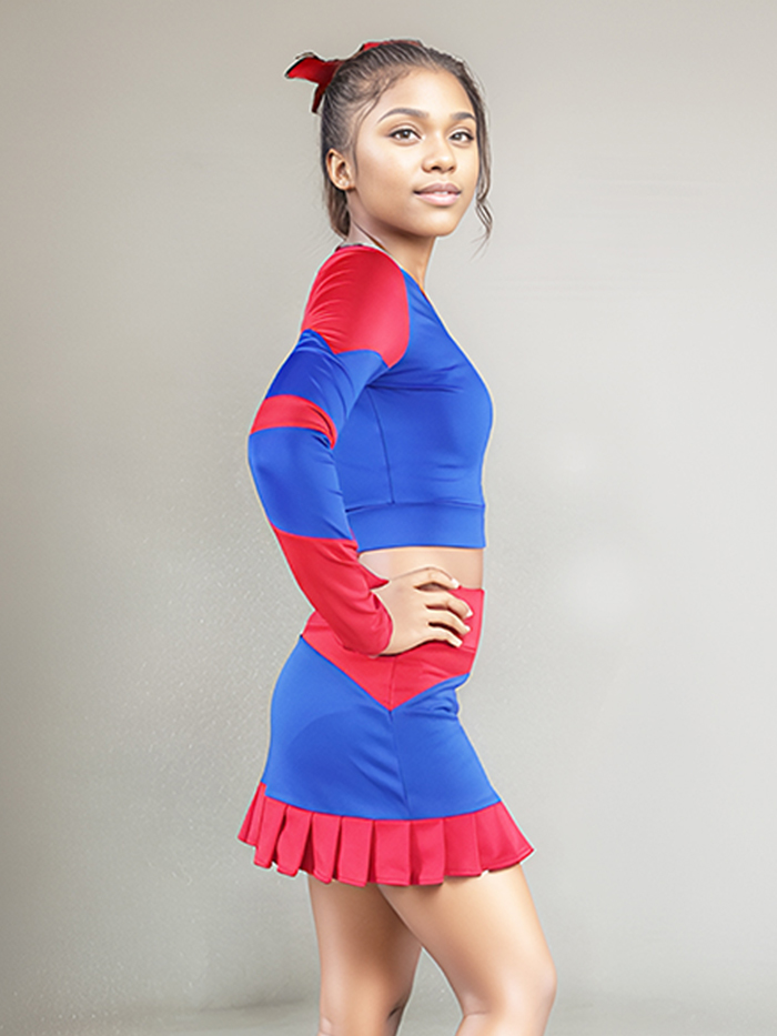 Bring bold energy to the floor with this striking 3-piece tackle twill cheer uniform in vibrant red and royal blue. Perfect for sideline or competition, this set includes:
