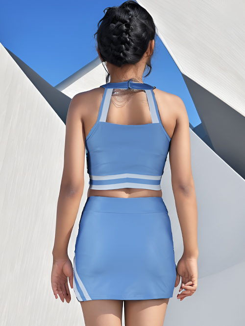• 2-piece cheer uniform: halter crop top + a-line skirt