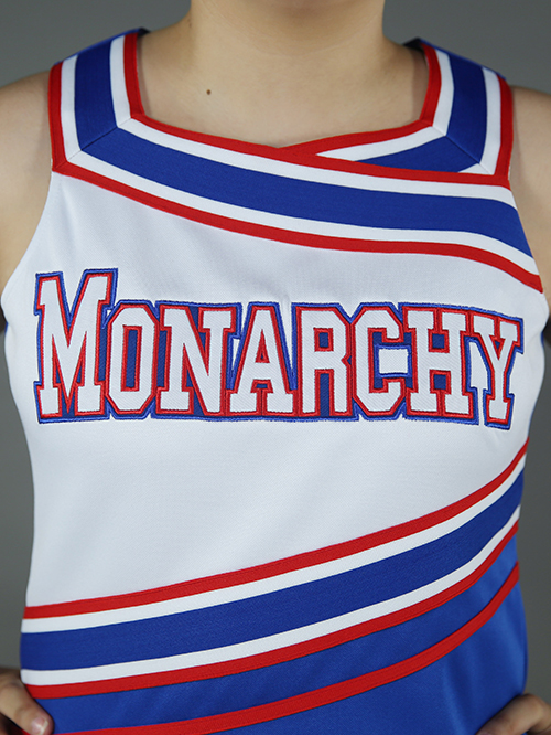 The fitted skirt follows through with clean striping at the hem for a coordinated, high-impact finish. This look is ideal for school teams wanting timeless sideline appeal with long-lasting performance wear.